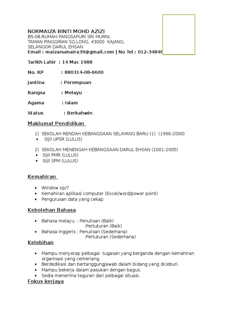 Contoh objektif kerjaya untuk resume 1. Contoh resume terbaik format lengkap untuk mohon kerja. View contoh resume bahasa melayu docdoc from ba 243 at universiti teknologi mara.